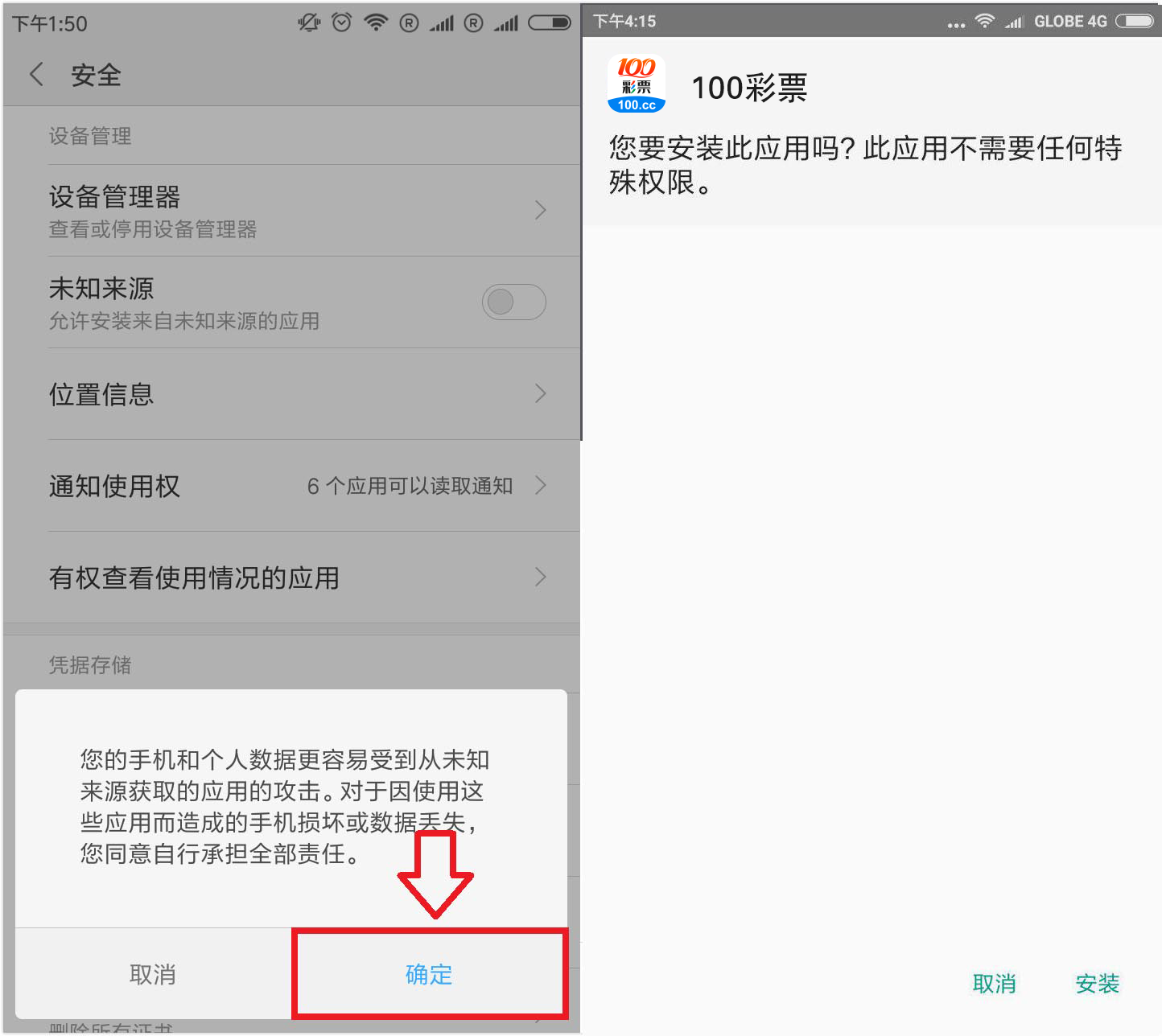 9. 点击弹窗上的"信任", 输入手机锁屏密码进行安装, 安装完成之后, 即可正常打开"100彩票"APP