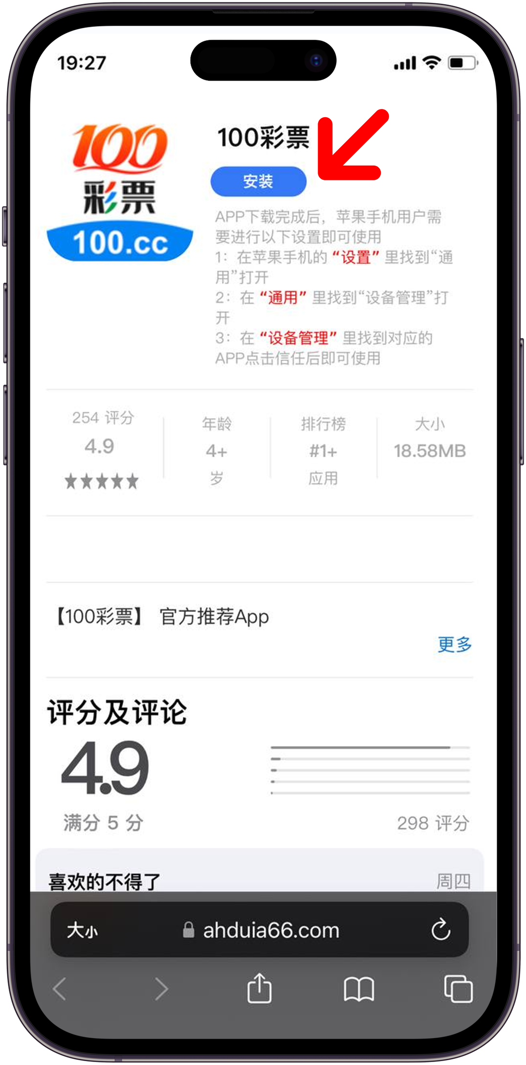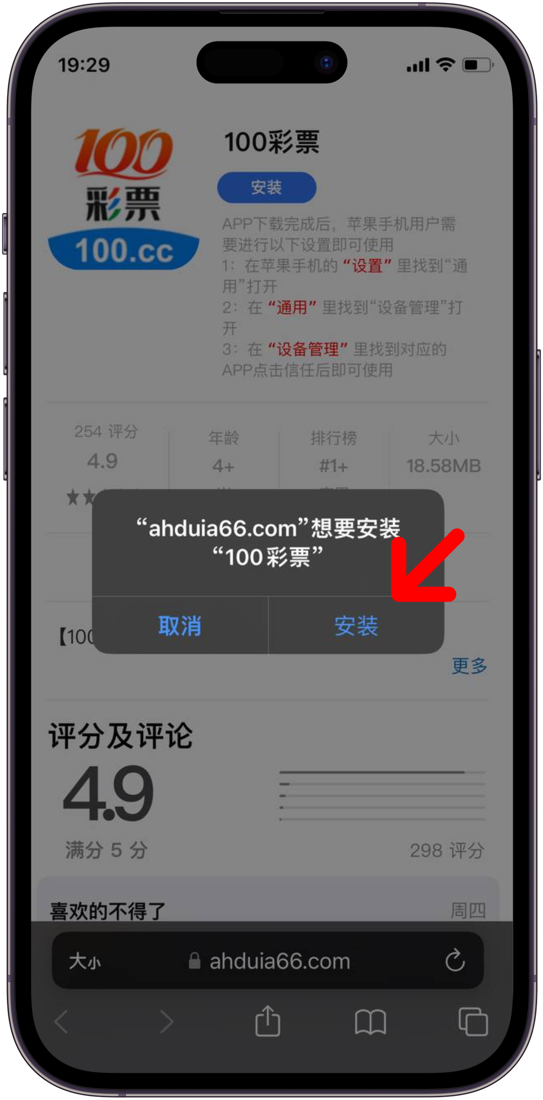 1. 手机访问100.cc, 点击苹果版本下载, 在新窗口点击"安装" (如上图所示)