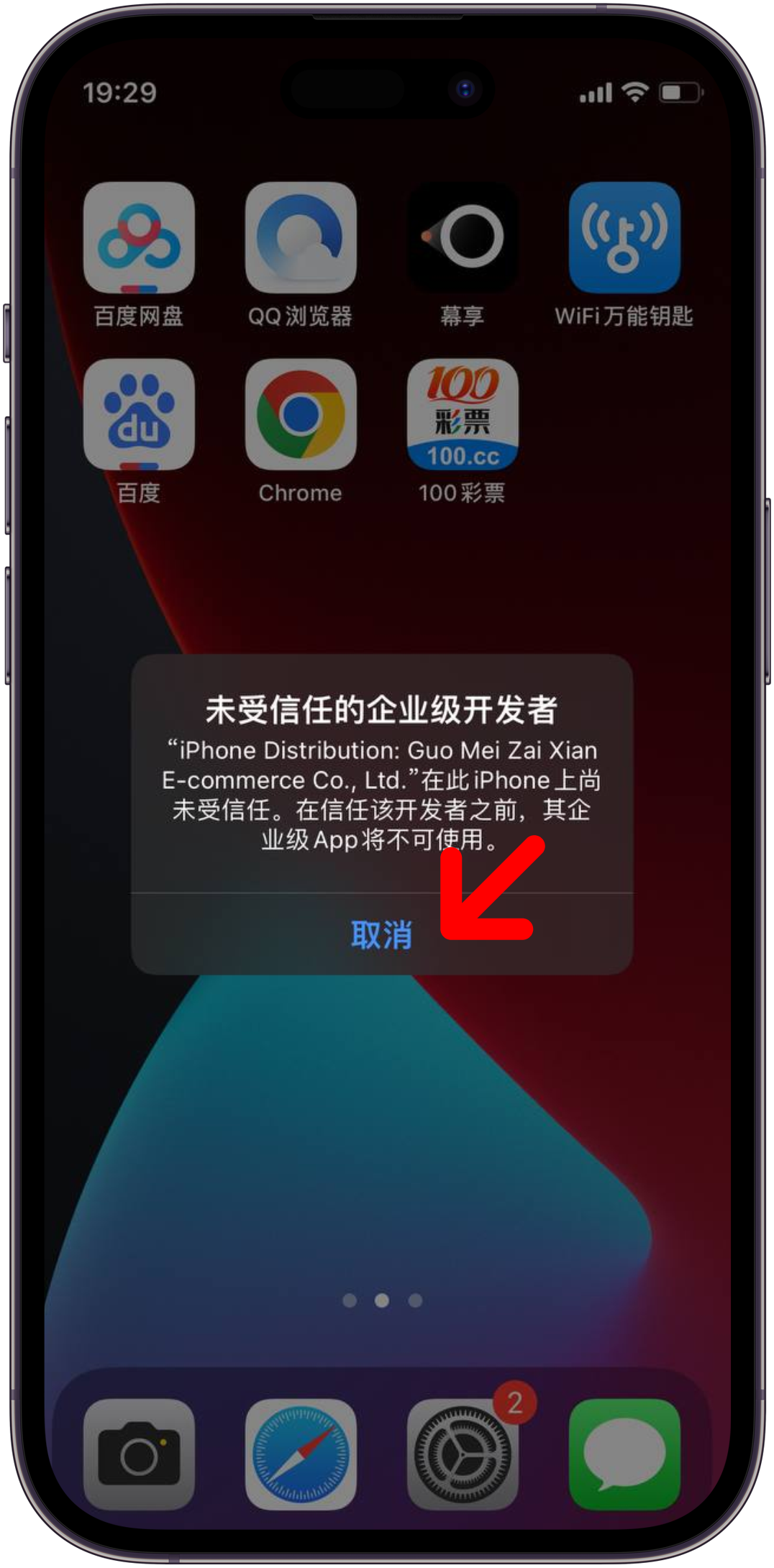 4. 提示未受信任的企业级开发者, 点击"取消"