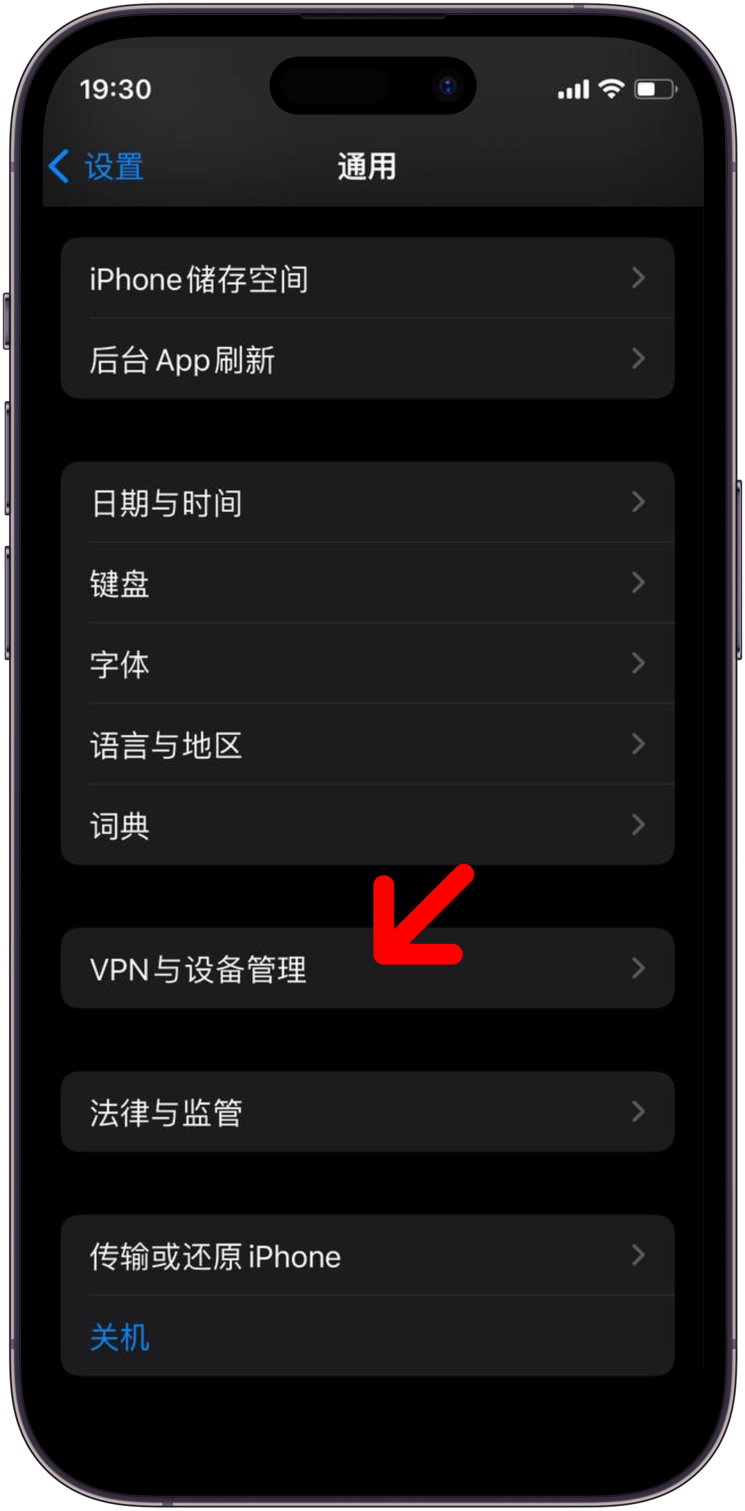 6. 找到VPN与设备管理, 点击进入
